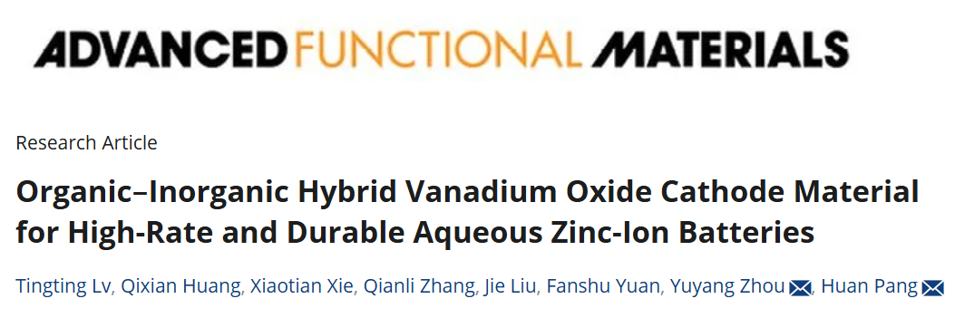 文章信息:Tingting Lv, Qixian Huang, Xiaotian Xie, Qianli Zhang, Jie Liu, Fanshu Yuan, Yuyang Zhou, *Huan Pang*. Organic-Inorganic Hybrid Vanadium Oxide Cathode Material for high-rate and durable aqueous zinc-ion batteries. Advanced Functional Materials, 2025, e24984. (IF=18.5)