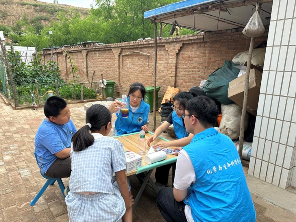 黄土高原的娃娃们在“蓝晒实验”的光化学互动中感受着科学魅力,在“熔岩灯演示”的趣味模仿中解读着化学原理,这些为孩子们量身定制的科普实验课程不仅仅是知识的传递,更多的是思政教育的薪火相传。“书香润童心”行动中,实践团给孩子们赠送《趣味科学实验》等读物,为学校捐赠涵盖自然科学、人文素养类图书数百册,建起了“流动的科普馆”。“这些书打开了新世界的大门”,学校教师的评价道出了文化帮扶中“精神滋养”的思政内涵。实践队成员们带着“家庭实验包”走进窑洞,在留守儿童家中开设了“移动课堂”。当食用油和色素在矿泉水瓶中舞动成“熔岩灯”时,孩子眼中迸发惊喜:“科学原来藏在厨房里!”这一刻,试管里的化学反应与幼小心底的温暖共鸣,让“服务人民”从课本概念,化为了灶台边绽放的知识光芒。