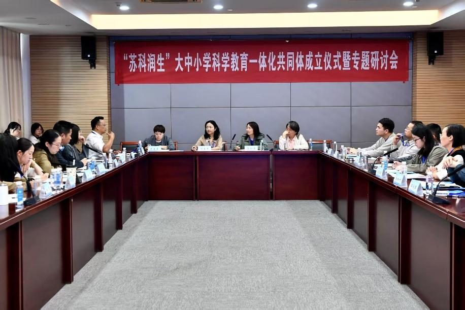成立仪式后,专题研讨会接续召开。首批成员单位领导和负责人结合中小学成员单位在未来农场、湿地保护、中草药种植、人工智能竞赛等领域的科学教育特色与实施基础,围绕“大中小学科学教育课程衔接”“科普资源共享机制”等核心议题展开深入研讨,凝聚起广泛共识。据悉,“苏科润生”共同体将以党的二十届四中全会精神为指引,紧扣全生命周期育人目标,重点推进三大行动:一是构建进阶式课程体系,按照“启蒙教育—兴趣引导—探究实践—创新研究”路径,整合高校学科资源与中小学教学需求,开发跨学科、实践性科学教育课程,落实《中小学科学教育工作指南》中“统筹校内校外资源力量”的要求;二是打造专业化师资队伍,通过科普思政名师工作室引领、聘任科技副校长和科学教育指导老师、开展科学教育骨干师资培训等方式,提升科学教育教师综合素养,助力“配齐配优科学类课程教师”政策落地;三是搭建多元化实践平台,开放高校实验室、科普馆、科普教育基地等优质资源,为不同年龄段中小学生提供沉浸式、体验式科学实践机会,推动科研资源向基础教育领域转化。