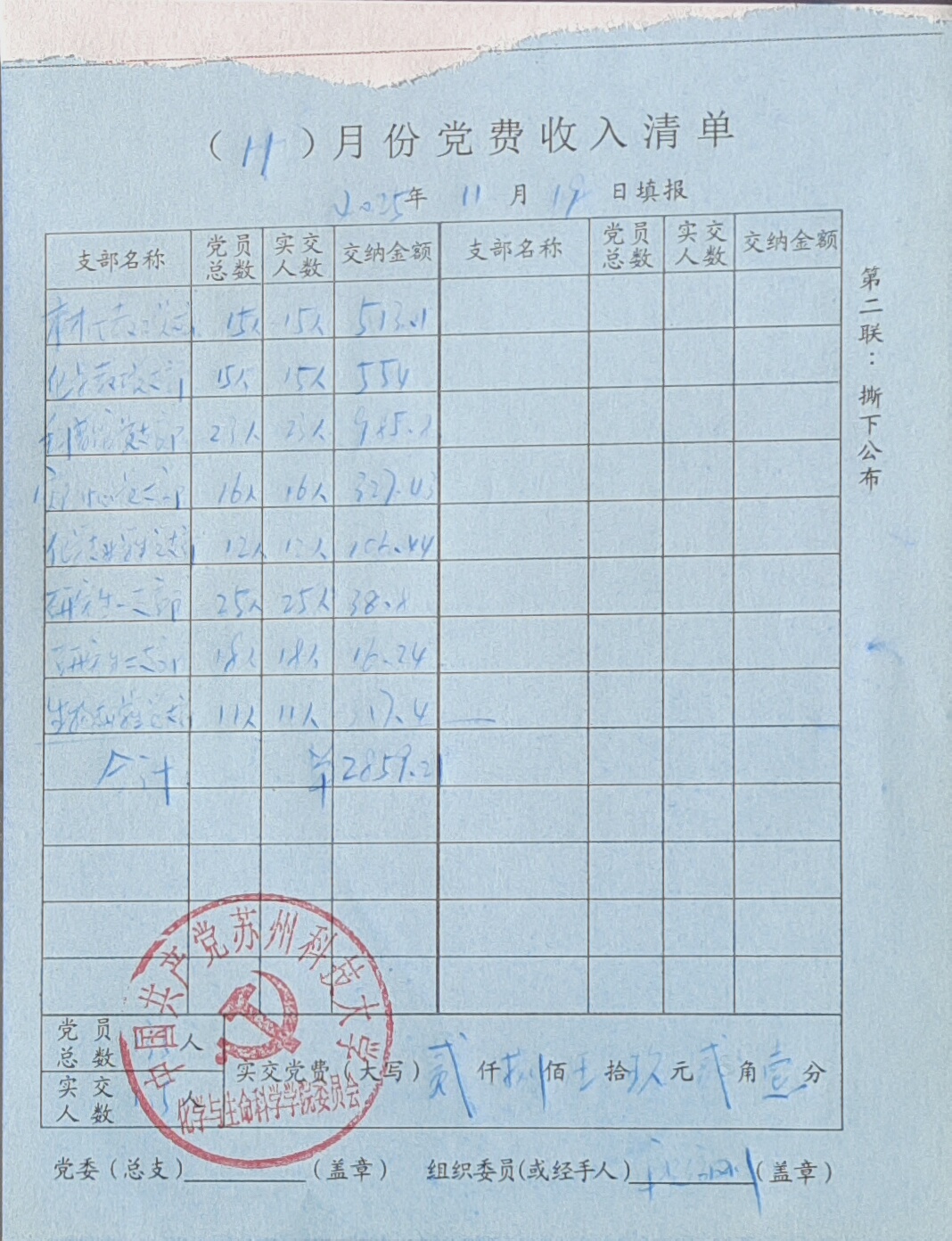 学院收到材化教工党支部、化学化工教工党支部、科普馆党支部、实验中心党支部、学生党支部135名党员交纳的11月份党费共计2859.21元。