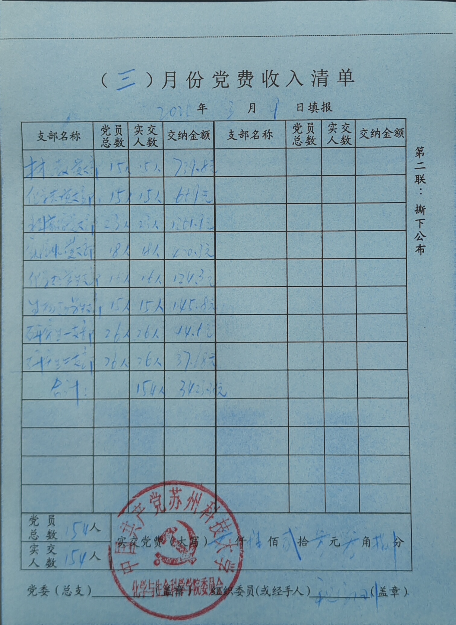 学院收到材化教工党支部、化学化工教工党支部、科普馆党支部、实验中心党支部、学生党支部154名党员交纳的3月份党费共计3423.38元。
