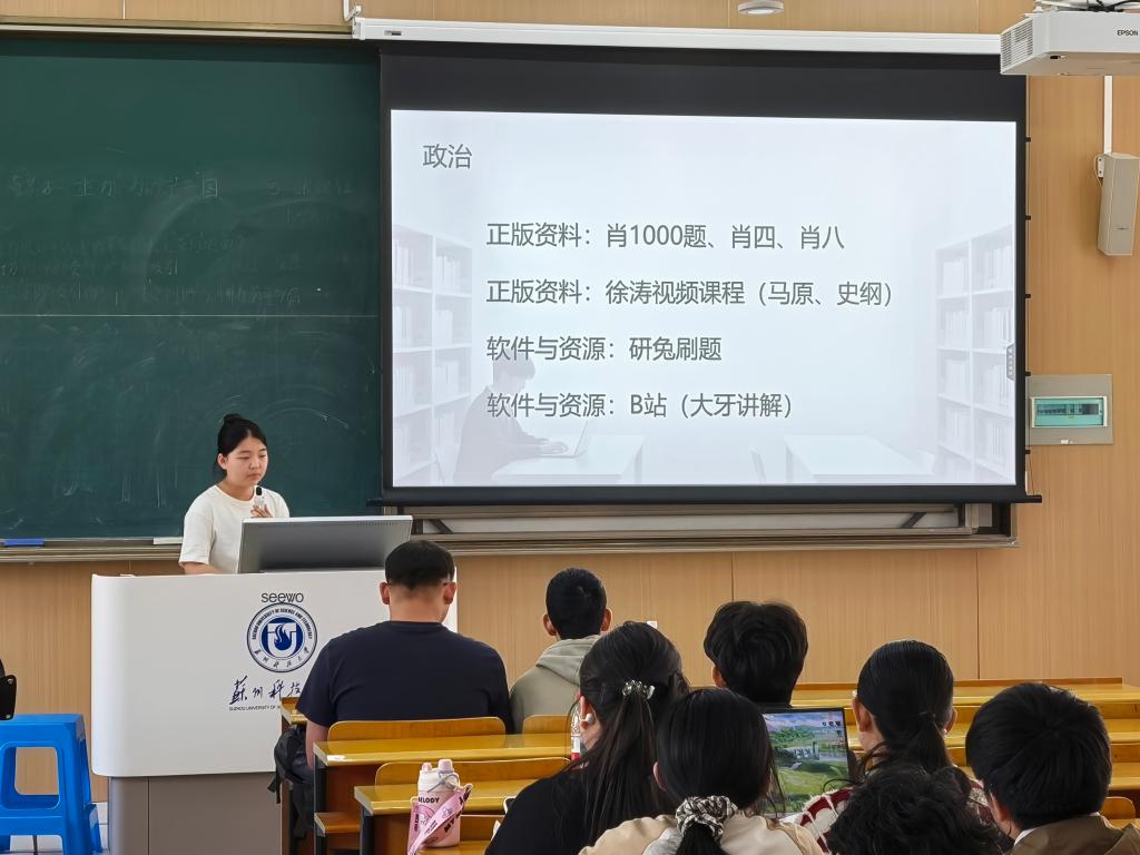 随后,伊绵帅从当前就业形势与职业发展角度出发,分析了考研深造对提升个人竞争力、拓宽发展路径的重要意义,鼓励同学们认清形势、坚定信心,以积极行动迎接挑战。